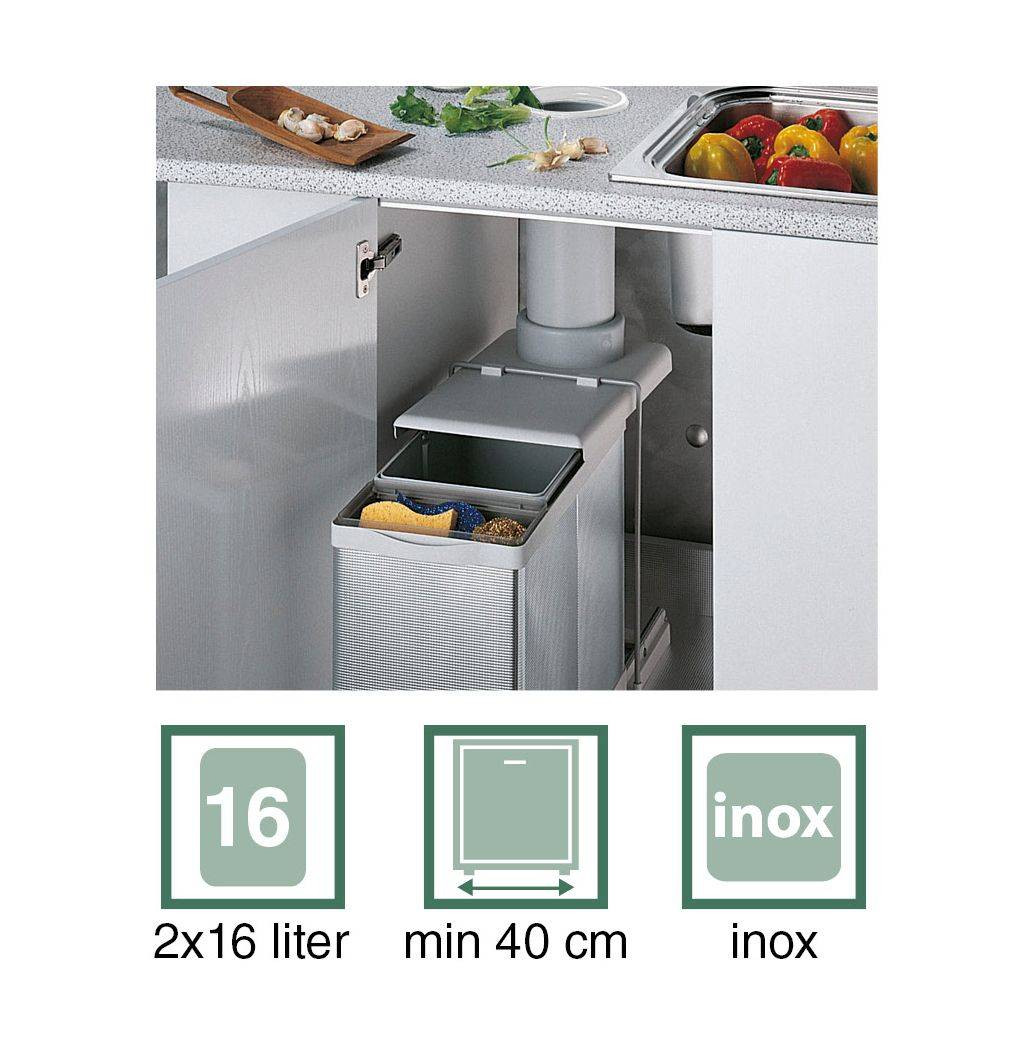 Kifejezetten a háztartási szelektív hulladékgyűjtés elősegítésére szolgál ez a rendkívül praktikus és könnyen használható szemetes. A kuka teljesen kihúzható. A rögzítés a szekrényelem aljához történik. A két kuka összesen 32 liter űrtartalommal bír. Minimum 40 cm széles alsó szekrénybe építhető.