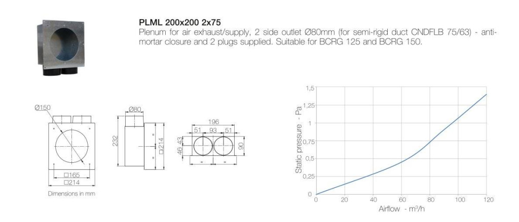 Horganyzott acéllemzből készült, központi hővisszanyerős szellőztetésnél a befúvási vagy elszívási pontok kialakítására alkalmas légtechnikai elem. 2 db 75 mm átmérőjű, a termék oldalán elhelyezett csőcsatlakozással és 1 db légszelep (NA 150 mm) vagy Aerauliqa BCRG 150 típusú design végelem csatlakoztatására alkalmas felülettel rendelkezik. Gipszkarton mögött elhelyezve mindössze 90 mm a mélységi mérete.