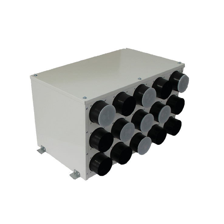 Horganyzott acéllemezből készült központi hővisszanyerős szellőztető rendszereknél alkalmazható osztó - gyűjtő elem 1 db 150 mm-es átmérőjű csőcsatlakozással és 15 db 75 mm átmérőjű csatlakozással, akusztikus szigeteléssel. A 150 mm-es csatlakozás a központi szellőztető készülékkel köthető össze ugyanilyen átmérőjű légtechnikai csővel, a kisebb méretű csatlakozási pontokat az egyes befúvási vagy elszívási pontokkal köthetők össze 75 mm külső átmérővel rendelkező, a kívánt méretben méretre vágott antibakteriális és antisztatikus légtechnikai csövekkel. Ez az osztóelem maximum 15 szellőztetési pont kialakítását teszi lehetővé.