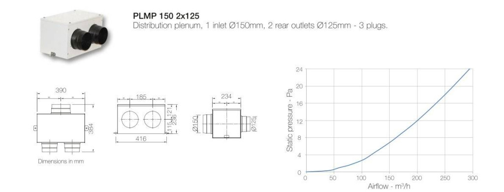 Horganyzott acéllemezből készült központi szellőztető rendszereknél alkalmazható osztó - gyűjtő elem 1 db 150 mm-es átmérőjű csőcsatlakozással és 2 db 125 mm átmérőjű csatlakozással, akusztikus szigeteléssel. A 150 mm-es csatlakozás a központi szellőztető készülékkel köthető össze ugyanilyen átmérőjű légtechnikai csővel, a kisebb méretű csatlakozási pontokat az egyes befúvási vagy elszívási pontokkal köthetők össze 125 mm külső átmérővel rendelkező, a kívánt méretben méretre vágott légtechnikai csövekkel. Ez az osztóelem 2 szellőztetési pont kialakítását teszi lehetővé.