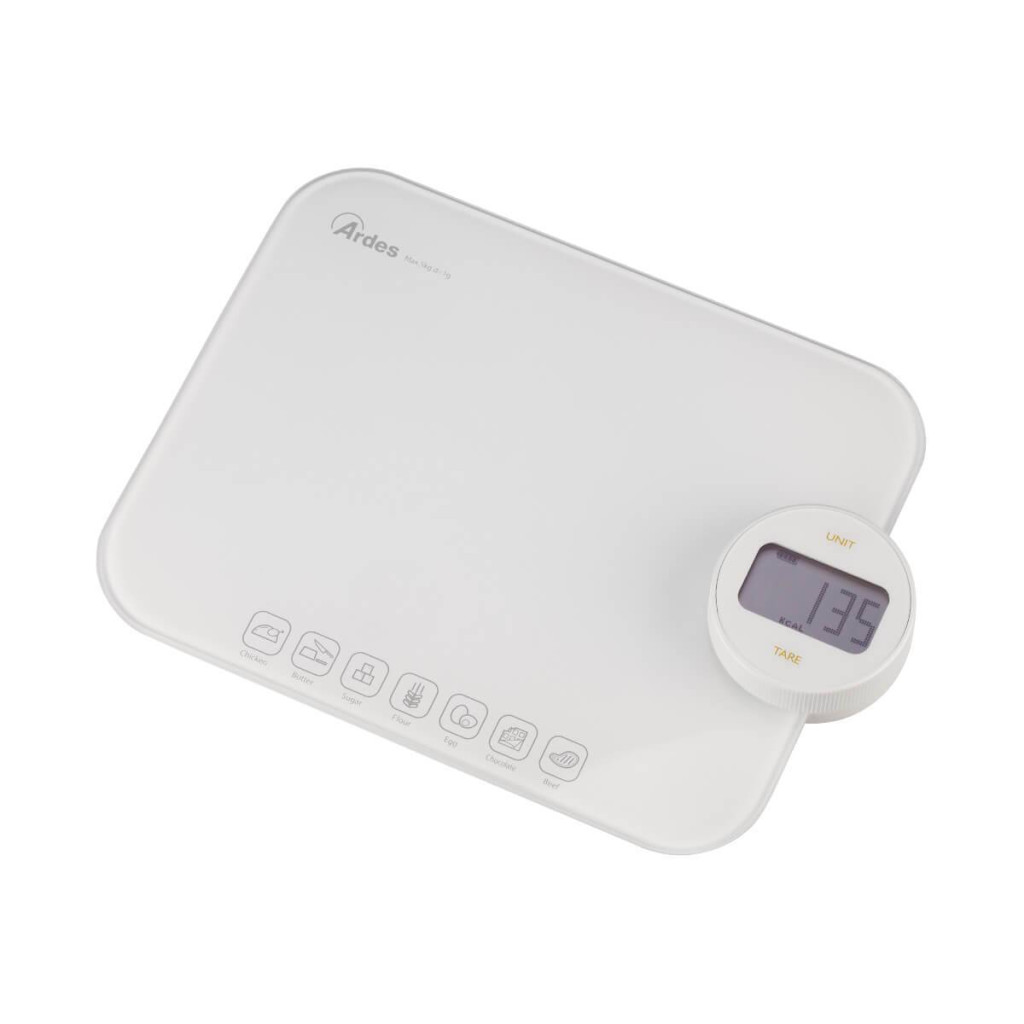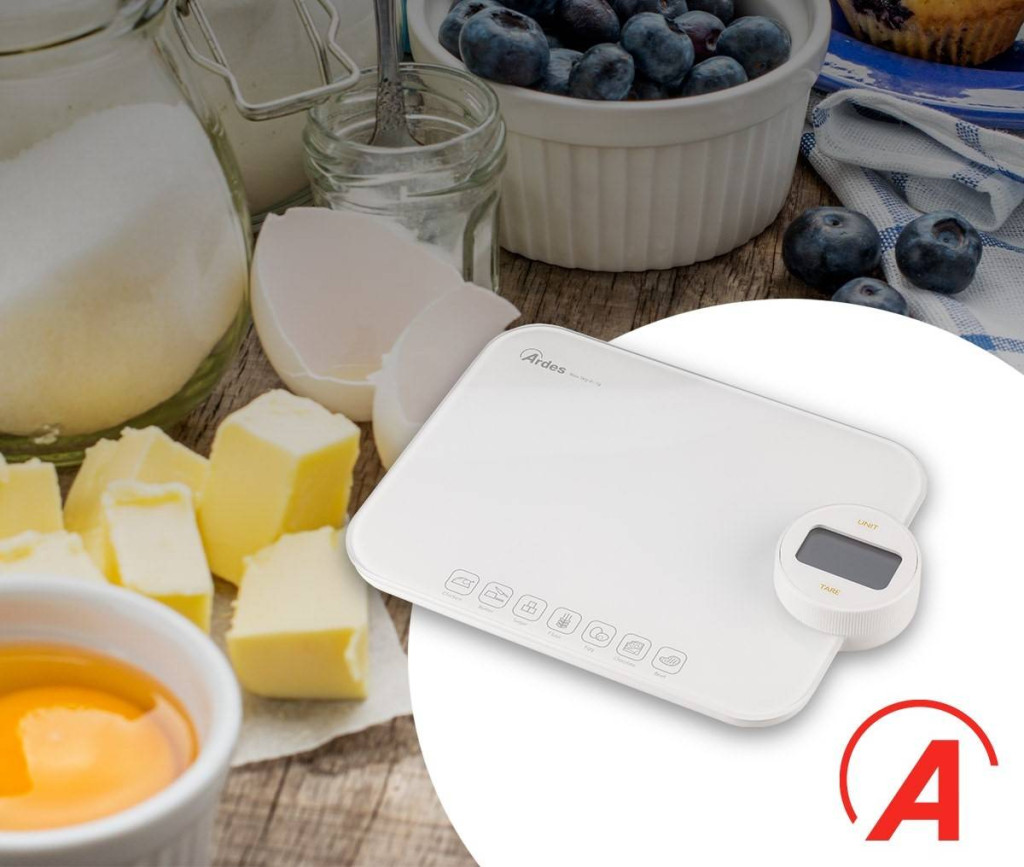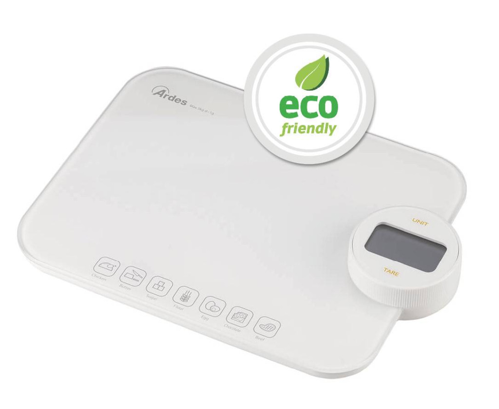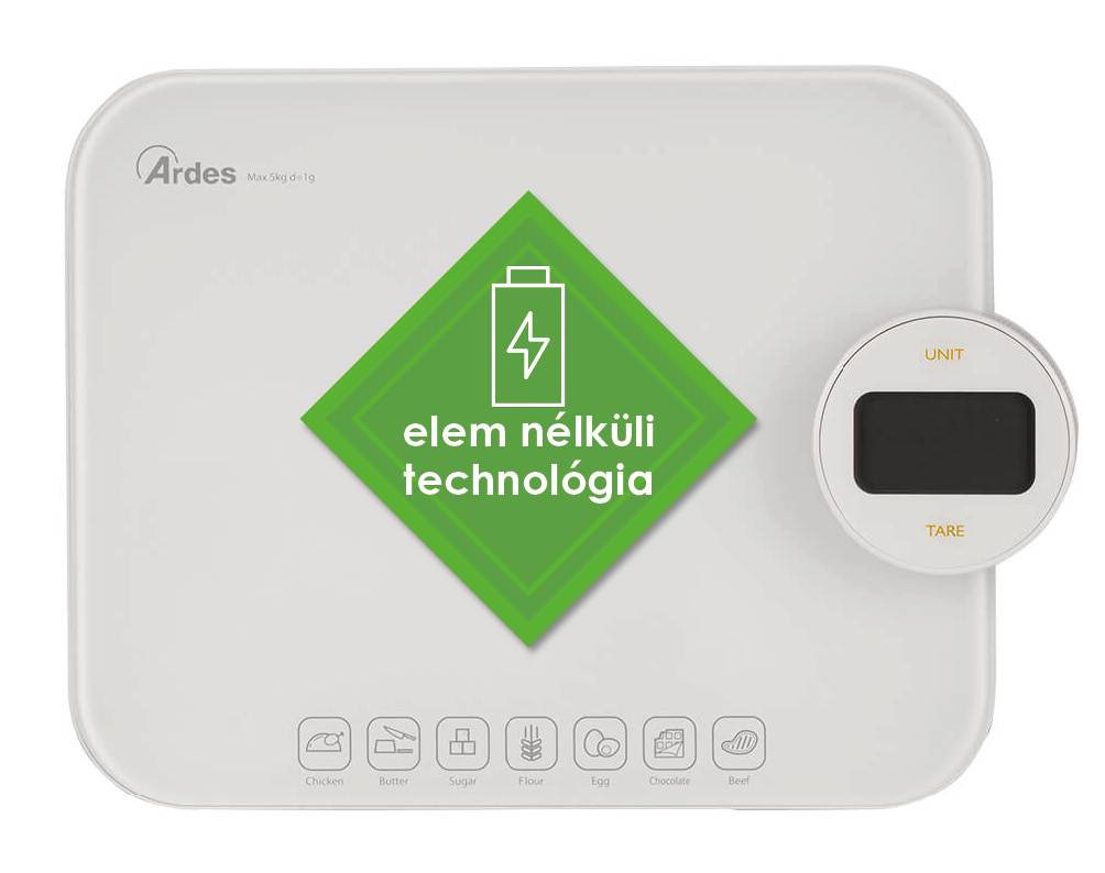 Környezetbarát, elem nélküli működtethető digitális konyhai mérleg, könnyen tisztítható, edzett üvegből készült mérő felülettel. Innovatív akkumulátor nélküli működés, manuálisan újratölthető, a kezelőgomb forgatásával. A beépített érintőgombokkal ellátott kalória-számláló lehetővé teszi a 7 leggyakrabban lemért élelmiszer kalóriájának kiszámítását és ellenőrzését: vaj, cukor, liszt, tojás, csokoládé, csirke és marhahús.