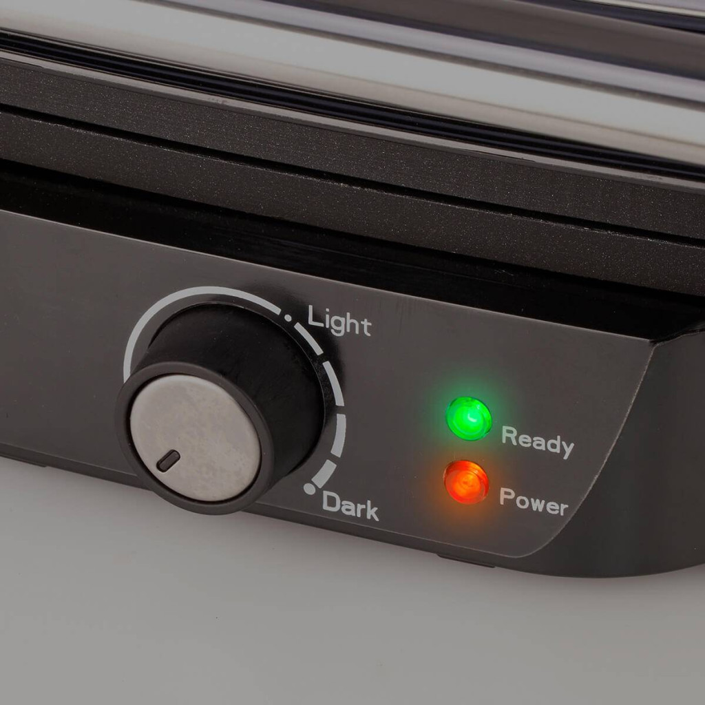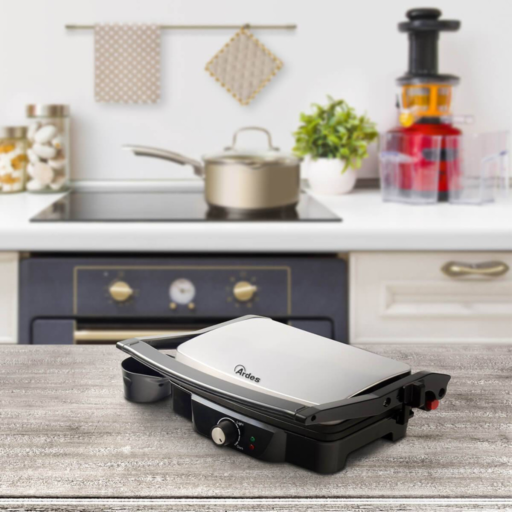 ARDES 1S20 elektromos kontakt grill elegáns rozsdamentes acél felülettel. Tapadásmentes bordázott grill lapok 27,8 x 17 cm méretben. Dönthető felső sütőlap különböző vastagságú ételekhez. 180°-ban nyitható grill lapok. Állítható hőmérséklet szabályozás. Piros és zöld fényjelző a bekapcsolás és a beállított hőmérséklet elérésének visszajelzésre. Fogantyú a biztonságos használathoz. Függőlegesen tárolható. Kábelcsévélő. Teljesítmény: 1500W