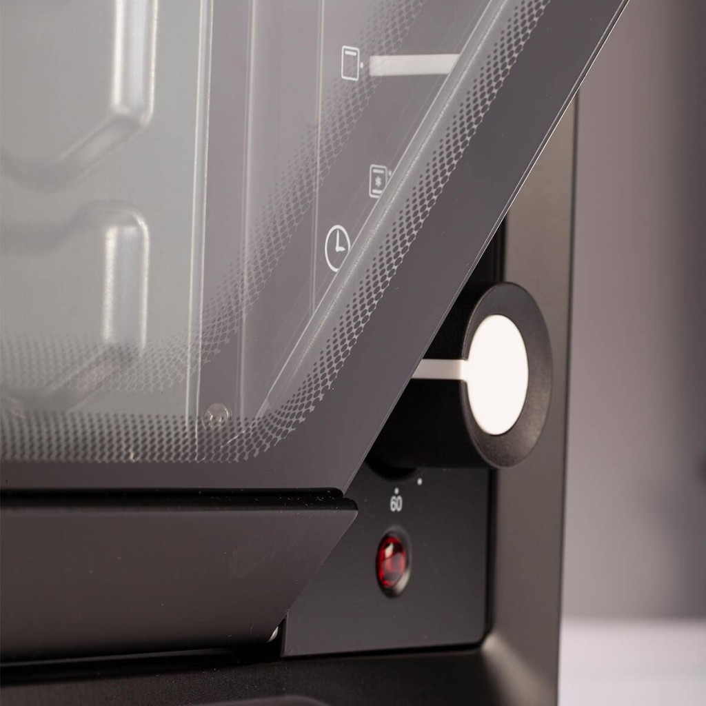 A mechanikus forgókapcsolós vezérlés egyszerű és megbízható működtetést kínál, amelyet bárki könnyedén átlát pár pillanat alatt. A 100–230 °C tartományban állítható termosztát pontos hőfokszabályozást tesz lehetővé, így minden fogás a kívánt hőmérsékleten készülhet el. A dupla üvegezésű ajtó stabil hőszigetelésről gondoskodik, és a sütőt kívülről is biztonságosabbá teszi. A működést jelzőlámpa mutatja, a 60 perces időzítő pedig automatikus kikapcsolással és hangjelzéssel biztosítja, hogy semmi ne égjen oda – Ön nyugodtan foglalkozhat más feladatokkal, amíg a sütő dolgozik.