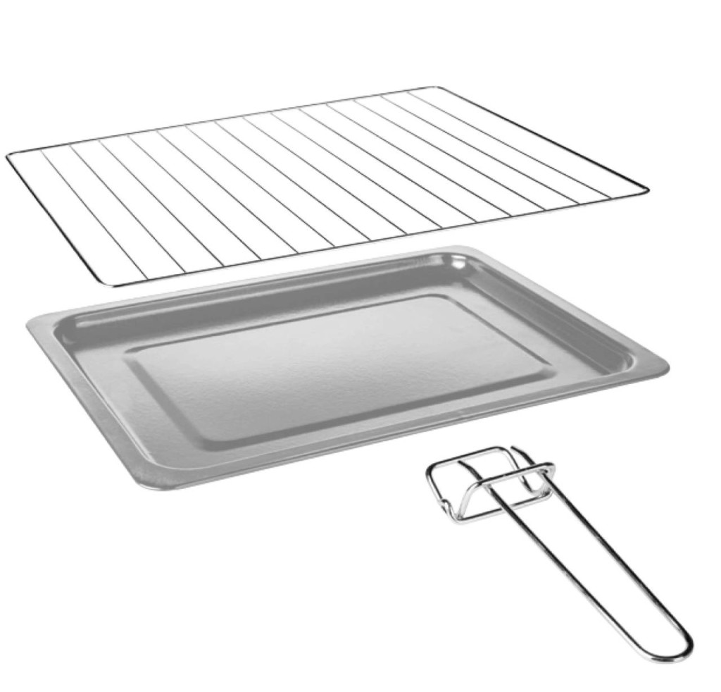 A sütőhöz egy tepsi, egy grillrács és egy praktikus tepsi fogó is tartozik. A 32,2 × 24,3 cm-es tepsi ideális méret a legtöbb étel elkészítéséhez, legyen szó házi pogácsáról, grillezett zöldségekről vagy egy könnyű húsételről. A dobozban minden tartozék megtalálható, amely a sütéshez szükséges, így a készüléket kicsomagolást követően akár azonnal használatba is vehet.