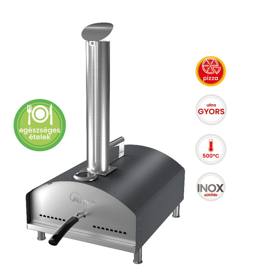 Az Ardes PIZ02 Dante kültéri pellet pizzasütő mely ideális választás pizzák, sütemények kültéri sütésére. Az pellet betöltését követően kb. 10 perc alatt 500 °C-ra melegíthetjük a sütőt. A készülék tartozékaként elérhető pizzakő a gyors felmelegedést követően a hőmérsékletet megtartva hosszú és egyenletes sütést biztosít. A rozsdamentes acélból készült kemence magas belsőhőmérsékletet a sütési idő alatt megtartja. A felmelegítéshez szükséges pellet a készülék hátsó nyílásán kényelmesen hozzáadható a tartozékként elérhető adagoló kanál segítségével.