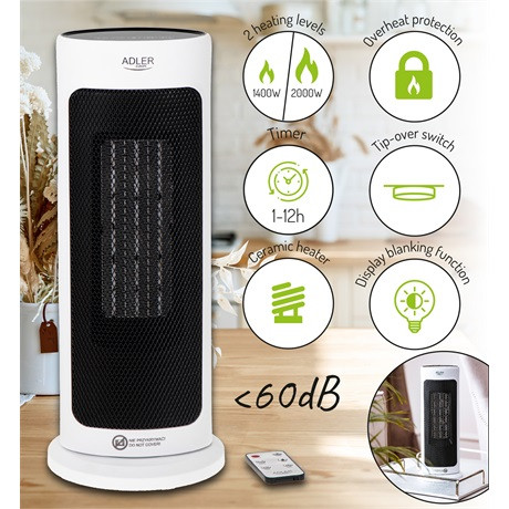 Fűtőventilátor hatékony kerámia fűtéssel, LED kijelzővel és távirányítóval. A készülék időzítővel rendelkezik, amely lehetővé teszi az üzemidő 1 és 12 óra közötti beállítását. LCD kijelző mutatja a kiválasztott hőmérsékletet 15-40°C tartományban, a kiválasztott funkciók aktiválásával. A fűtőventillátor 1400 W vagy 2000 W teljesítménnyel fűt, vízszintes oszcillációs funkcióval rendelkezik 50°-os tartományban, biztonsági kapcsolóval, amely a készülék felborulása esetén automatikusan megszakítja az áramellátást, túlmelegedés elleni védelemmel és egy fogantyúval a könnyű hordozhatóság érdekében. A készülék távirányítóval van felszerelve.