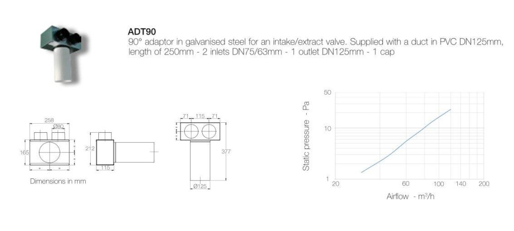 Légtechnikai végelem hővisszanyerős szellőztető készülékkel szellőztetett lakások / irodák légtechnikai csőrendszerének kialakításához. A szellőztetni kívánt helyiségek irányába elvezetett, 2 db 75/63 mm-es átmérőjű légtechnikai cső végéhez illeszthető. A csőcsatlakozás kialakítását követően, a végelemhez befúvásra vagy elszívásra alkalmas tányérszelep (125 mm-es csatlakozással), vagy állítható keresztmetszetű Aerauliqa design végelem illeszthető.