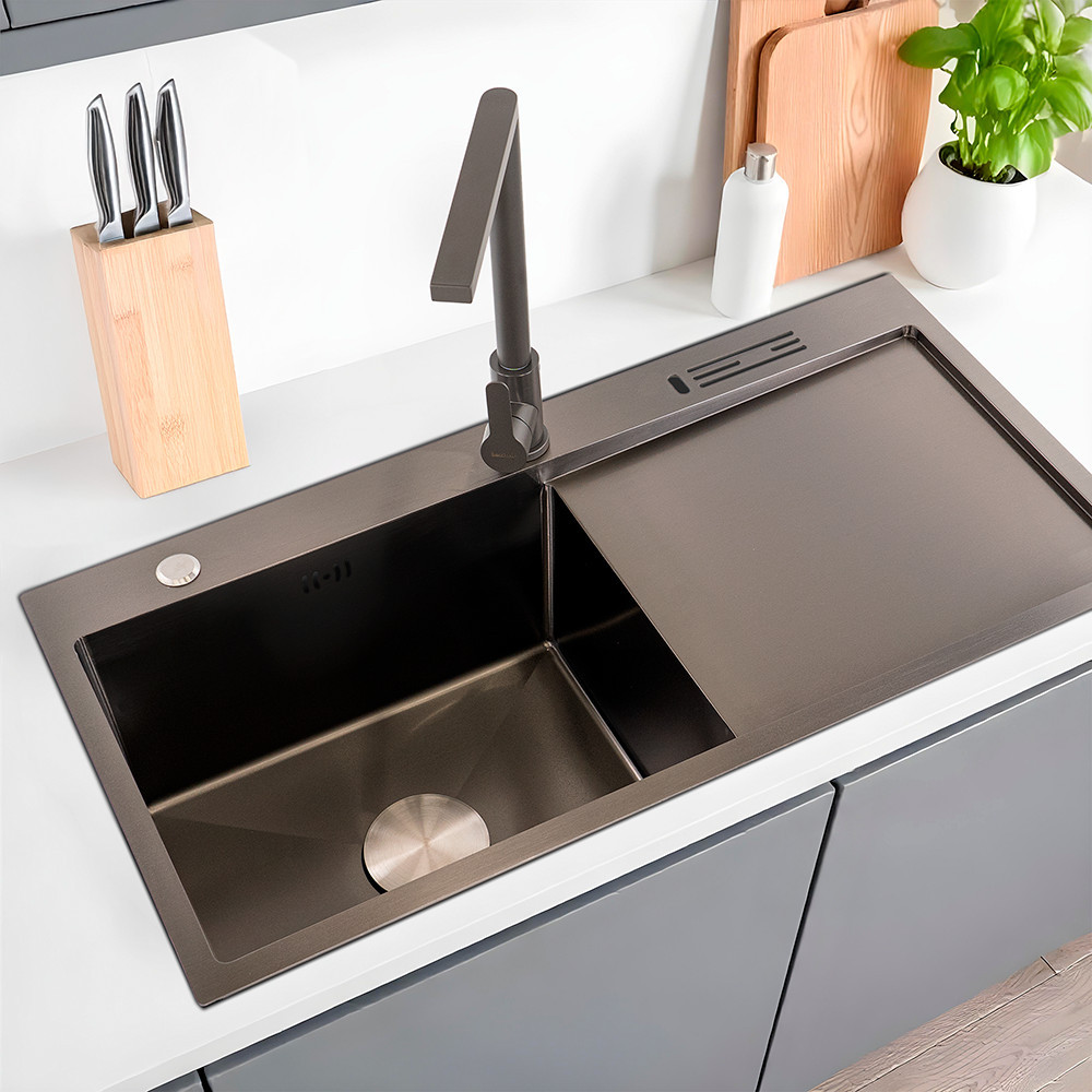 A nano technológiával ellátott rozsdamentes acél réteg nemcsak esztétikai előnyöket nyújt, hanem megvédi a mosogatót az olajfoltoktól és a szennyeződésektől. A precíz kivitelezés és a 3+0.8 mm vastagságú anyag biztosítja a maximális ellenállást a mindennapi használat során.