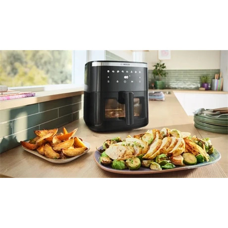 A Bosch Serie 6 Air Fryer már 65%*-kal gyorsabb sütést biztosít, így kevesebb időt kell szánnia az étel elkészítésre és többet az élvezetére. Továbbá a rövidebb sütési idővel akár 70%* -kal több energiát is megtakaríthat. *Közepes mennyiségű (300g) adag étel készítés esetén tesztelve egy hagyományos alsó-felső sütési funkcióval ellátott 71 l-es A+ energiaosztlyú sütőhöz viszonyítva.