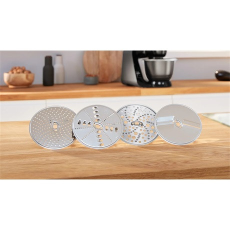 - Alaptartozékok: 1 x Fedél, 1 x Szeletelőfeltét, 1 x Nemesacél keverőtál, 1 x Húsdaráló, 1 x Fém dagasztóbetét, 1 x Turmixkehely, műanyag, 1 x Megfordítható reszelőkorong, 1 x Reszelőkorong, durva, 1 x Reszelőkorong, középfinom, 1 x Megfordítható szeletelőkorong