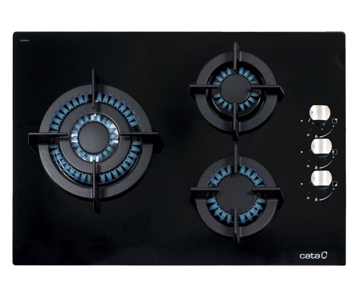 3 gázégő égésbiztosítóval, automata szikragyújtás, fekete üveg felület, öntöttvas rács, teljesítmény: 6,25 kW, 1 db közepes gázégő - 1,75 kW, 1 db tripla koronás WOK gázégő - 3,5 kW, 1 db normál gázégő - 1 kW