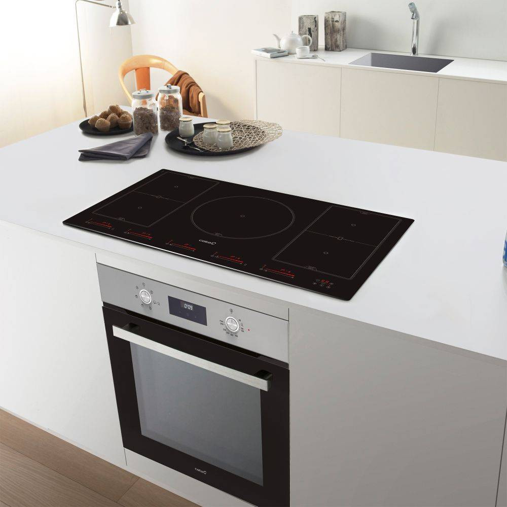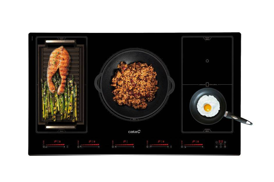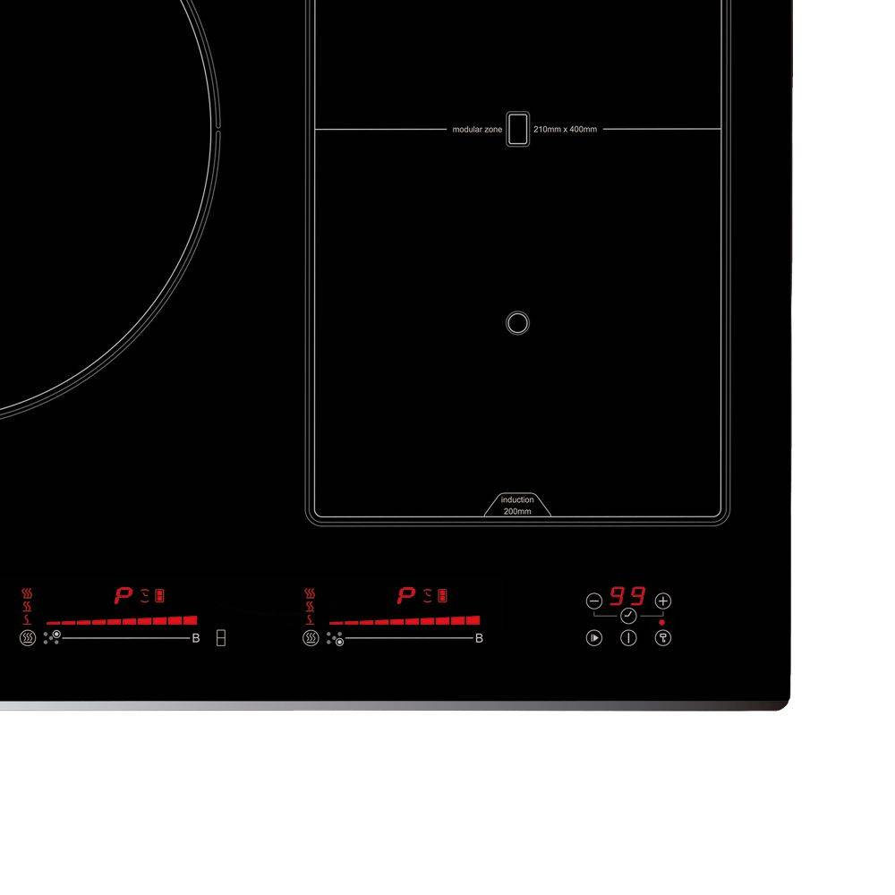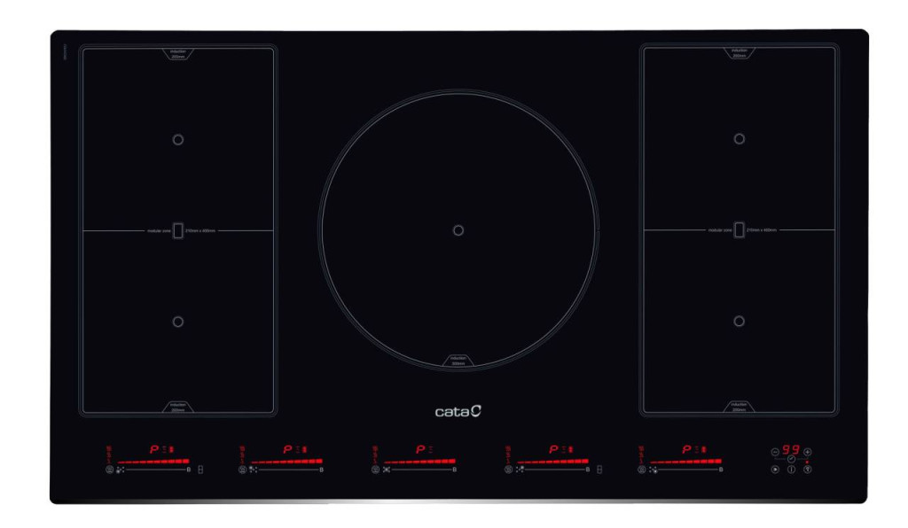 5 Indukciós főzőzóna, Touch Control érintővezérlés, 1 db 300 mm-es, 4 db 210x200 vagy 2 db 210x400 mm-es moduláris indukciós főzőzóna, 3 főzési funkció: olvasztás (45-55ºC), melegítés, melegen tartás (65-70 ºC), forralás (85-95ºC), 9 fokozat, időzítő, gyerekzár, automata kikapcsolás, maradékhő kijelzés, teljesítmény: 9 kW, Quick-Fix System
