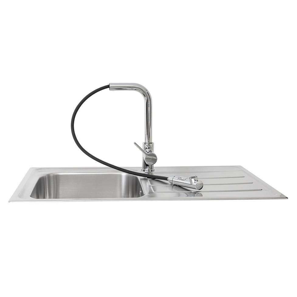 1 medencés mosogatótálca csepegtetővel, munkalapra szerelhető, magas minőségű AISI 304 18/8 rozsdamentes acél, hangcsillapító habréteg a mosogató alsó részén, 0,8 mm lemezvastagság, szekrényméret: 450 mm, méret: 790x500 mm, medence mélység: 180 mm, tartozékok: rögzítő fülek, szifon készlet és szűrőkosár