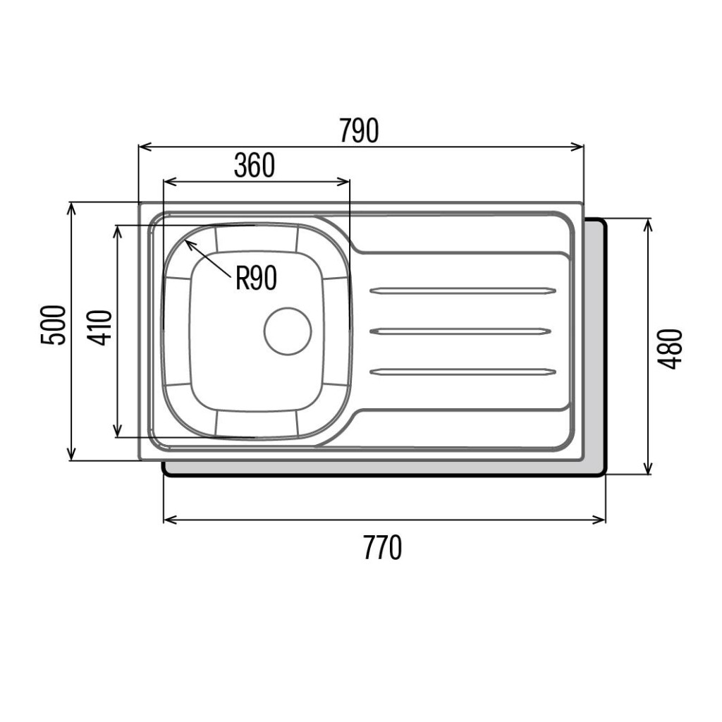 Az egymedencés kialakítás mellé praktikus csepegtetőfelület társul, így a mosogatás minden mozzanata kényelmesen és rendezetten végezhető. A bal oldalon elhelyezett medence 180 mm-es mélysége ideálissá teszi a nagyobb edények, serpenyők tisztításához is. A 790x500 mm-es teljes tálcaméret elegendő helyet biztosít a mindennapi használathoz, miközben helytakarékos megoldás marad a kisebb konyhákban is. A finoman ívelt, R90-es sarokkialakítás megkönnyíti a vízelvezetést, és egyszerűsíti a tisztítást.