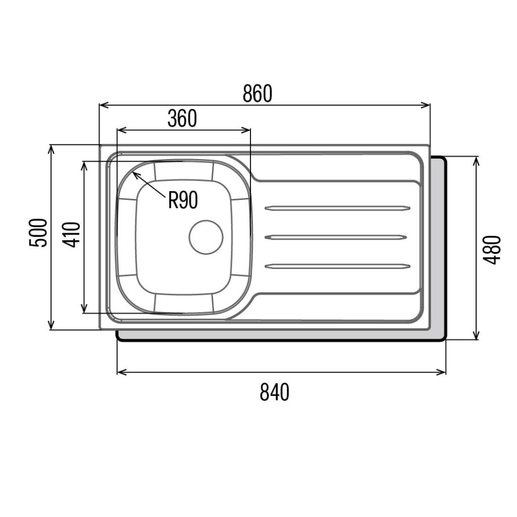Az egymedencés kialakítás mellé praktikus csepegtetőfelület társul, így a mosogatás minden mozzanata kényelmesen és rendezetten végezhető. A bal oldalon elhelyezett medence 180 mm-es mélysége ideálissá teszi a nagyobb edények, serpenyők tisztításához is. A 860x500 mm-es teljes tálcaméret elegendő helyet biztosít a mindennapi használathoz, miközben helytakarékos megoldás marad a kisebb konyhákban is. A finoman ívelt, R90-es sarokkialakítás megkönnyíti a vízelvezetést, és egyszerűsíti a tisztítást.