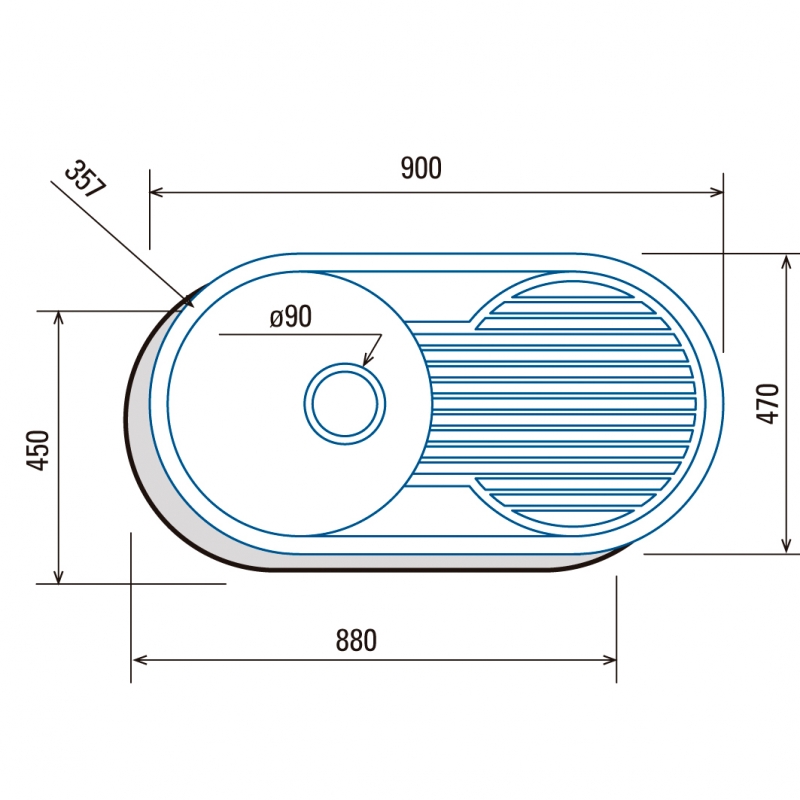 A 900×470 mm-es teljes méret és az 150 mm mély medence tökéletes arányt kínál a kényelmes használathoz. A 880×450 mm-es kivágási méret pontos illeszkedést biztosít, így a telepítés során nem lesz szükség utólagos módosításokra.