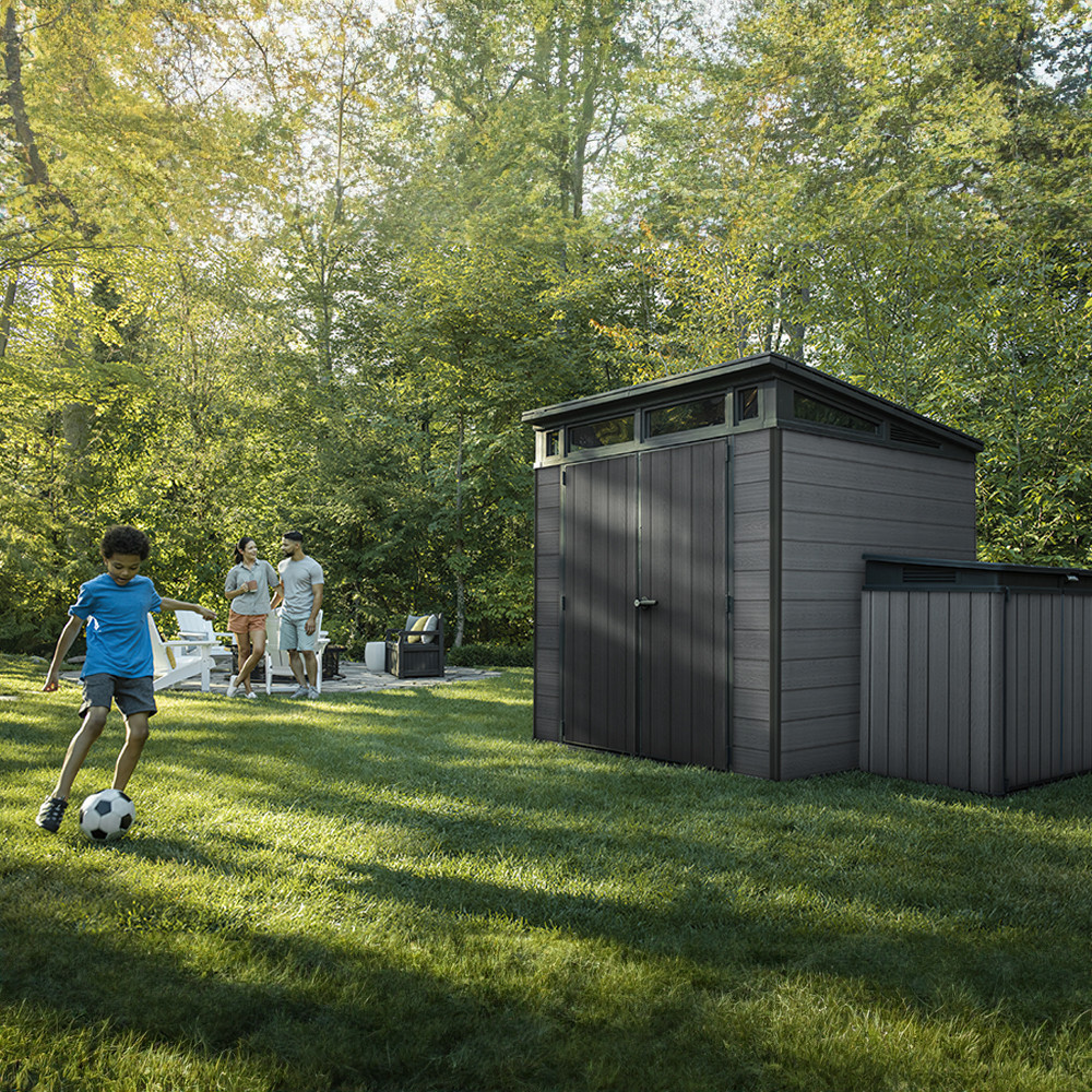 A Cortina kerti ház formatervezése a modern építészeti vonalakat követi. A ferde tető és az ablaksáv feletti dizájnja az egyszerűség és elegancia jegyében készült, amely tökéletesen illeszkedik a modern kerti környezetbe, miközben praktikus tárolóhelyet biztosít.