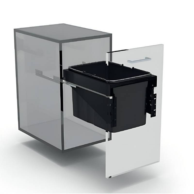 Ajtófrontra szerelhető, teljesen kihúzható, lágyan záródó hulladékgyűjtő rendszer, szelektív hulladékgyűjtéshez.