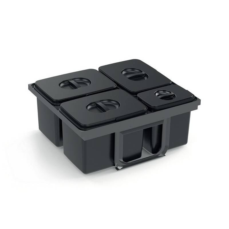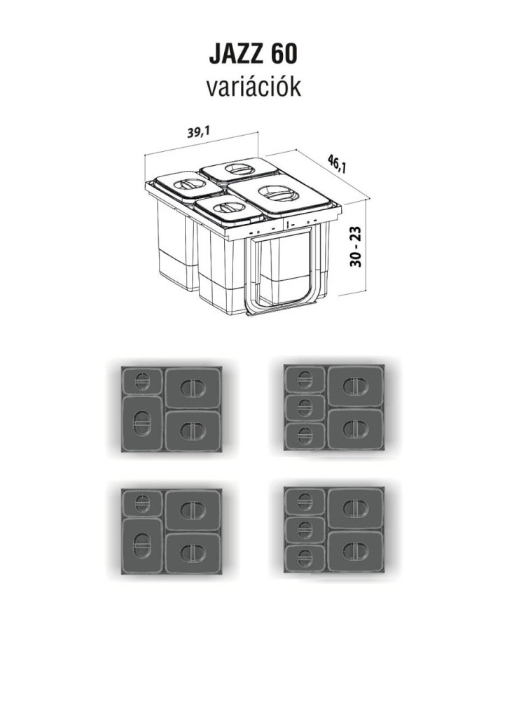 szelektív hulladékgyűjtési lehetőség, rugalmasan összeállítható kombinációk, optimalizált helykihasználás, könnyen kivehető akár mosogatógépben is mosható fedeles szemetes vödrök, egyszerű és gyors telepítés (akár 3 perc alatt beszerelhető)