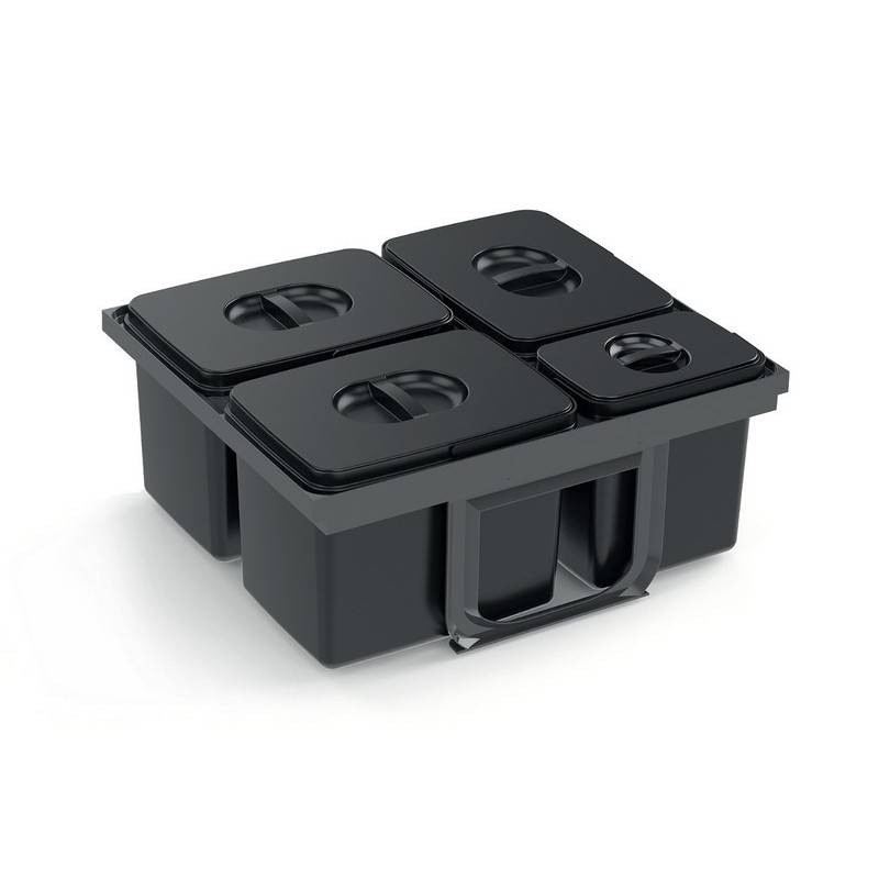 szelektív hulladékgyűjtési lehetőség, rugalmasan összeállítható kombinációk, optimalizált helykihasználás, könnyen kivehető akár mosogatógépben is mosható fedeles szemetes vödrök, egyszerű és gyors telepítés (akár 3 perc alatt beszerelhető)
