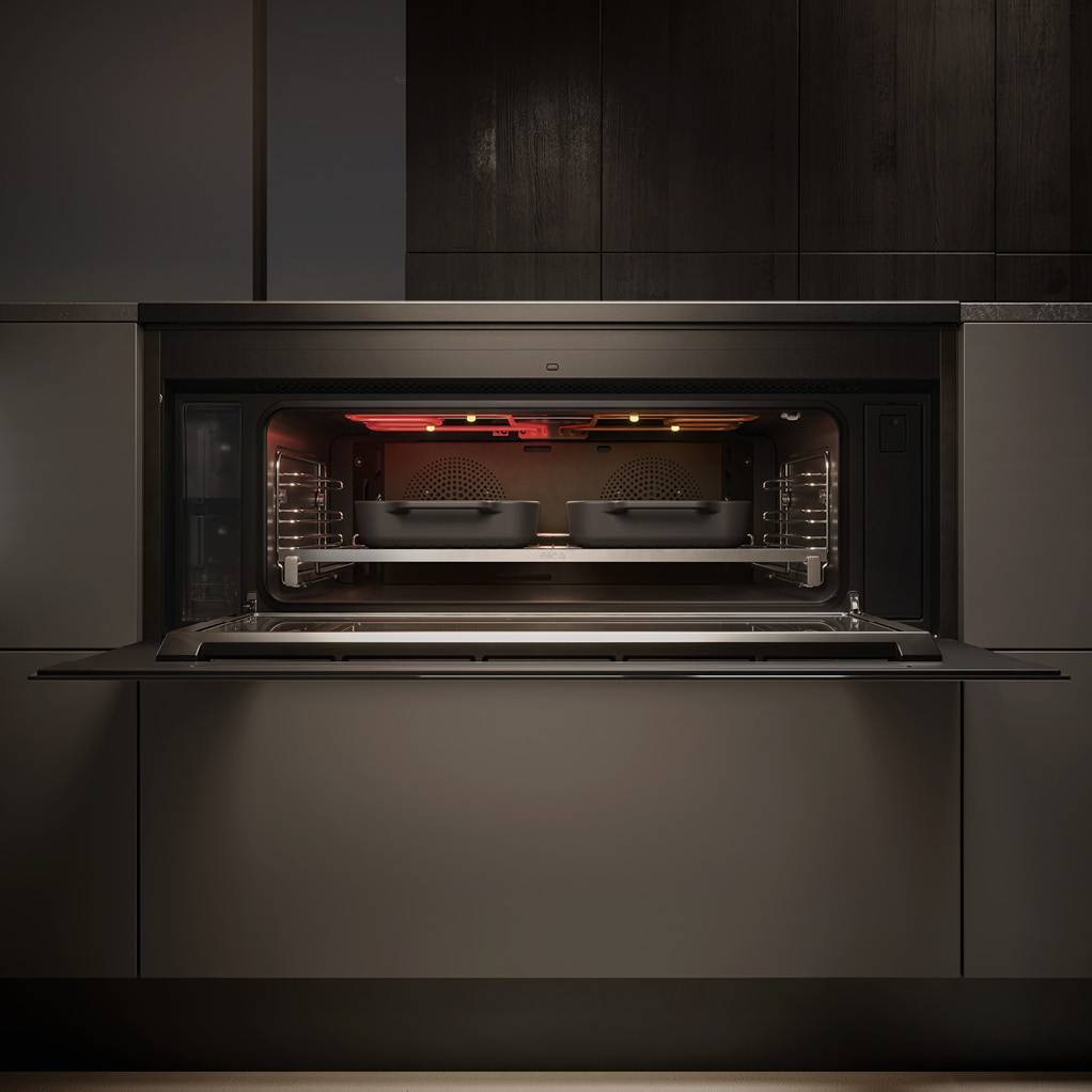 Még soha nem látott ilyen sütőt sem kívül, sem belül. A sütőtér szélessége (30%-kal nagyobb, mint a szabványos sütőké) lehetővé teszi két tepsi egymás melletti elhelyezését, nagy méretű étel vagy nagy mennyiségű sós snack vagy muffin sütését. És ez még nem minden: kombinálhatja a hagyományos főzési módokat a gőzöléssel, valamint a grillsütőnek csak a felét is melegítheti, hogy energiát takarítson meg. Ezenkívül az automatikus programjainak – az edény egyszerű kiválasztásával – és az ételszondának köszönhetően a sütő mindent elvégezhet ön helyett.