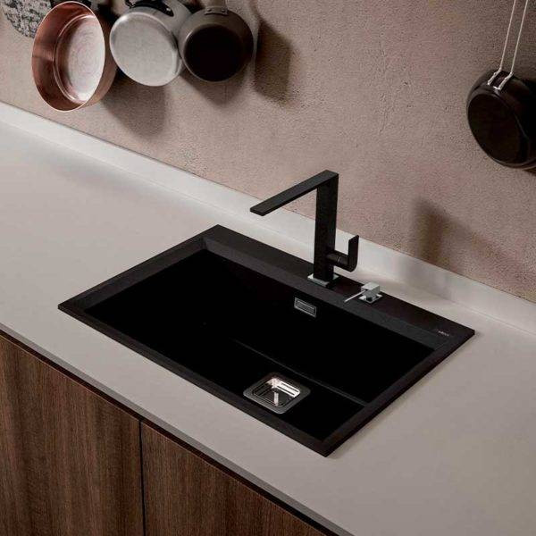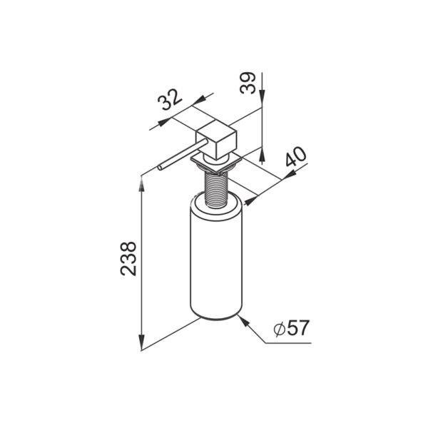 Kompakt négyzet alakú mosogatószer-adagoló 35 mm-es furattal, rozsdamentes acél adagolófejjel és műanyag tartállyal.