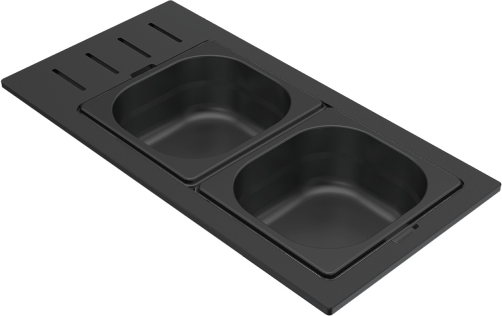 A két különálló, a keretből könnyedén kiemelhető edény maximális rugalmasságot biztosít a mindennapi konyhai munkavégzés során. Ideális alapanyagok, fűszerek vagy kisebb konyhai eszközök rendszerezett, higiénikus tárolására, valamint előkészítésére. A kivehető kialakítás lehetővé teszi a kényelmes használatot és a gyors, egyszerű tisztítást.
