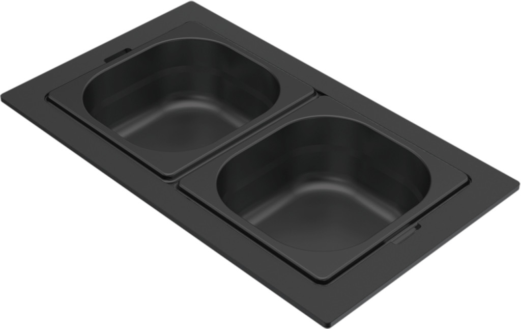A két különálló, a keretből könnyedén kiemelhető edény maximális rugalmasságot biztosít a mindennapi konyhai munkavégzés során. Ideális választás alapanyagok, fűszerek vagy kisebb konyhai eszközök higiénikus és átlátható tárolására, illetve előkészítésére. A kivehető kialakítás megkönnyíti a tisztítást és a közvetlen használatot is.