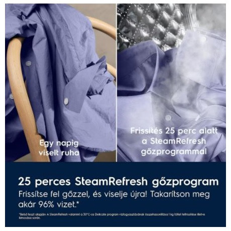A 25 perces SteamRefresh program ideális a finom holmik felfrissítéséhez. Ráadásul kevesebb vizet használ, mint egy hagyományos mosóprogram. A még frissebb illat érdekében használjon Electrolux gőzillatosítót.
