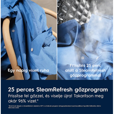 *Belső teszt alapján: 1 kg-os töltet frissítése gőzprogramon összehasonlítva a 30°C-os Delicate programon történő mosással.