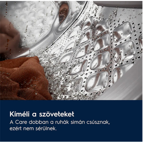 A Care dobban a ruhák simán csúsznak a dob felszínéből kiemelkedő párnaszerű mintázaton és az újratervezett átemelőkön. A dob különleges mintázatának köszönhetően még kíméletesebb a ruhák mosása.