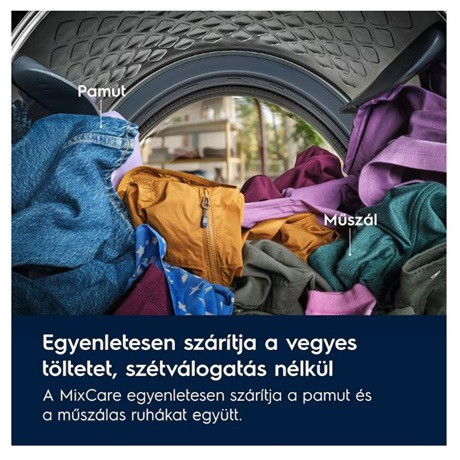 A MixCare hatékony, mégis kíméletes szárítást biztosít a pamut és szintetikus ruhákból álló vegyes töltetekhez, biztosítva a ruhák egyenletes száradását, szétválogatás nélkül.