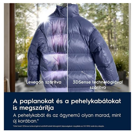 A 3DSense technológia - a legfejlettebb technológiánk - méri a ruhák nedvességtartalmát a precíz és alapos szárítás érdekében. Vastagságtól függetlenül még a paplanok és a pehelykabátok is egyenletesen száradnak, miközben megőrzik puhaságukat és melegentartó képességüket.