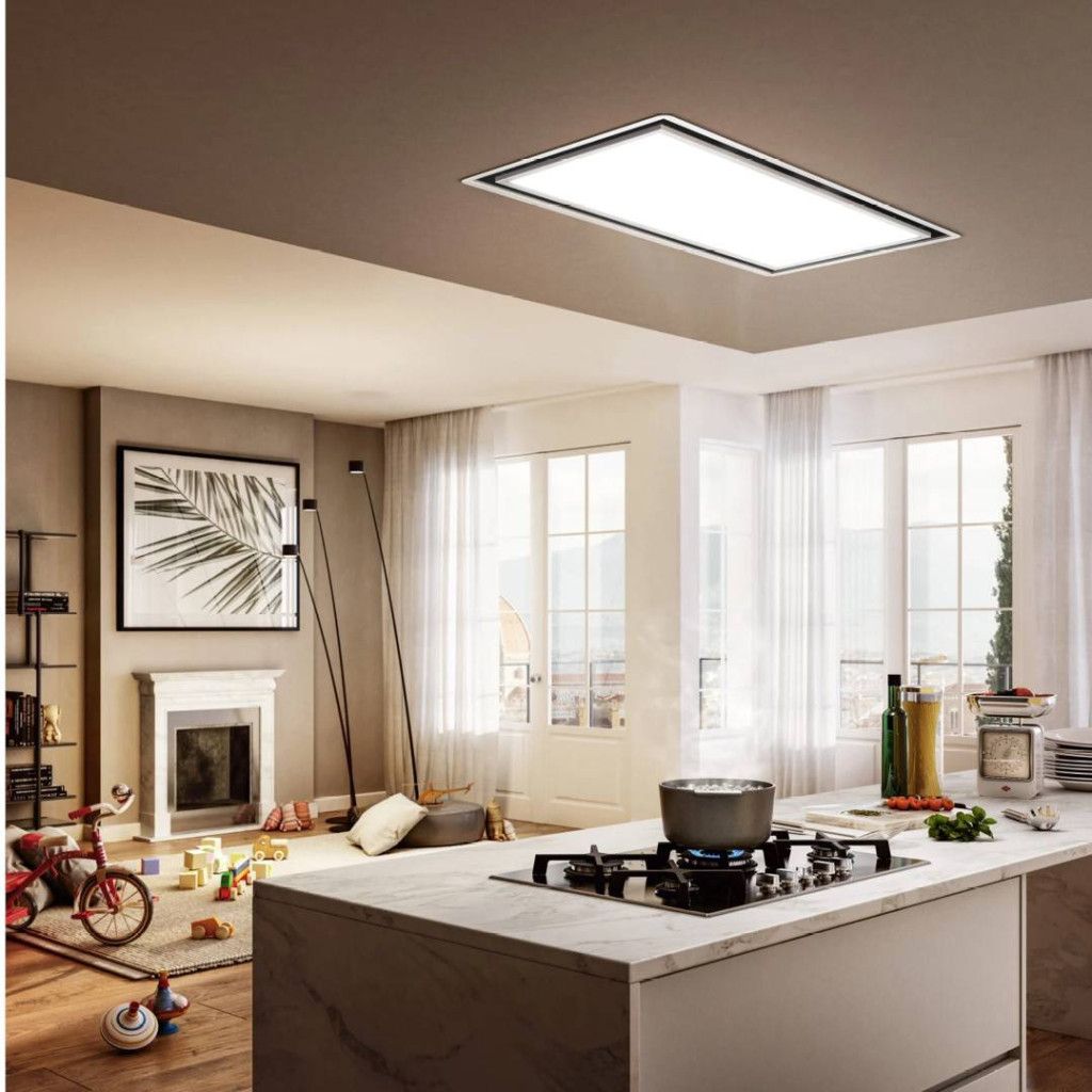 Mennyezeti páraelszívó, amelyet úgy terveztek, hogy fényt hozzon a konyhába. Az elszívó rendszer rejtve van, így helyet hagy a LED-panelnek, amelynek fényerősségét és tónusát is lehet állítani.