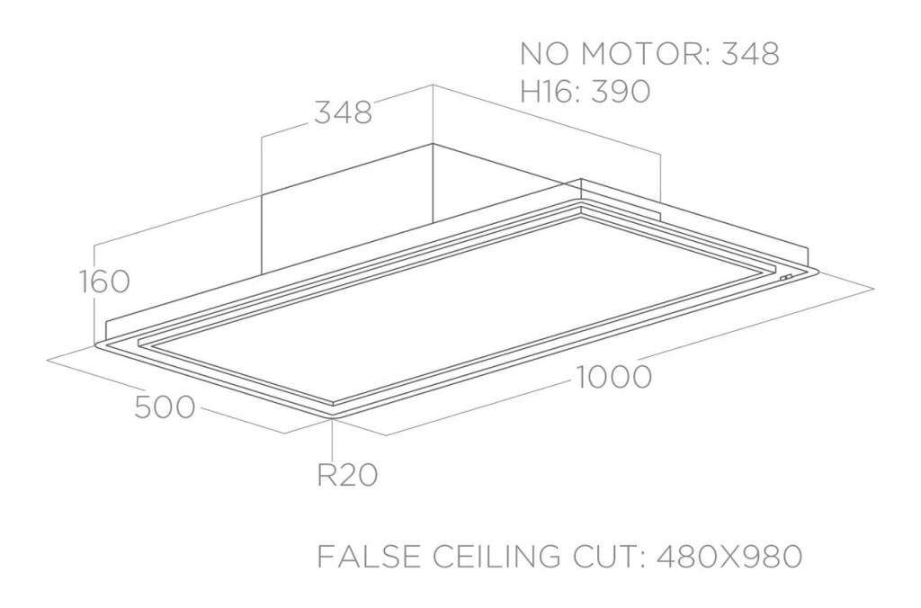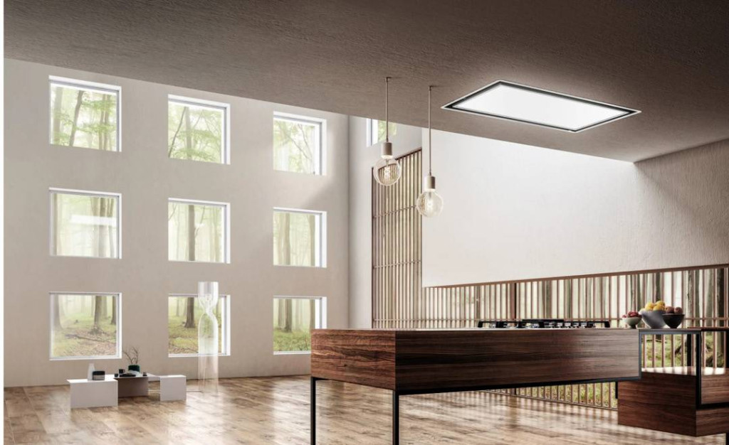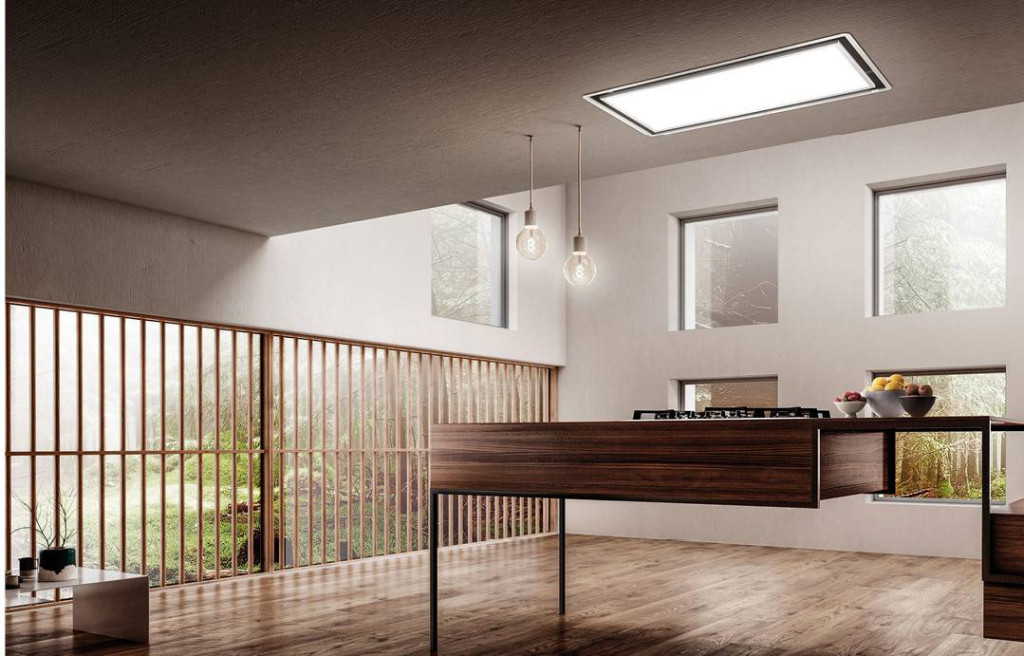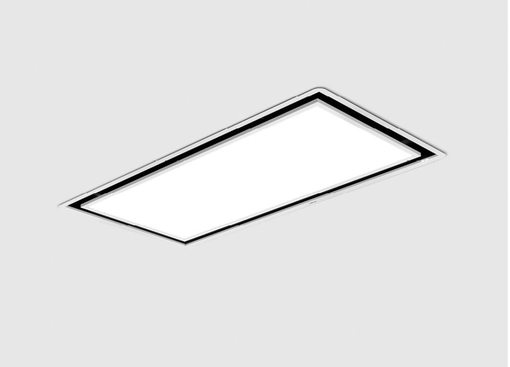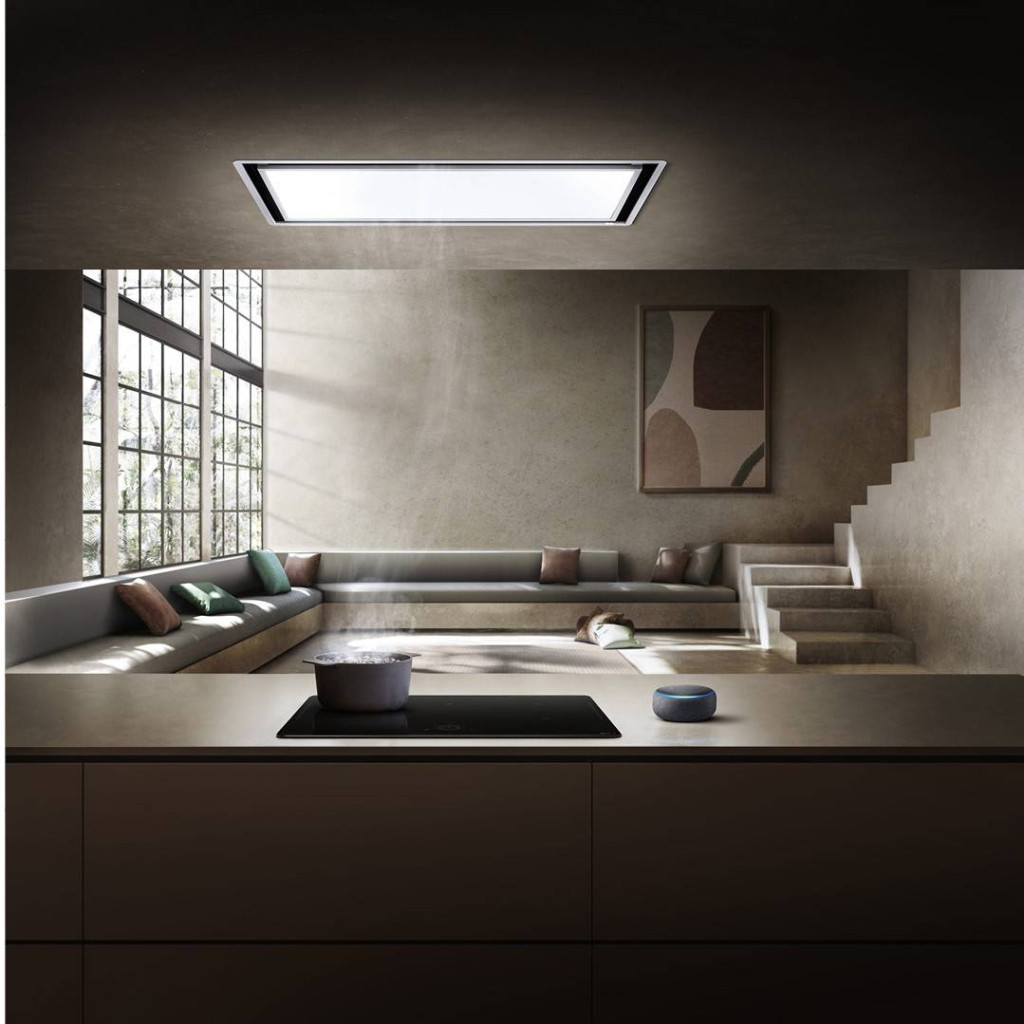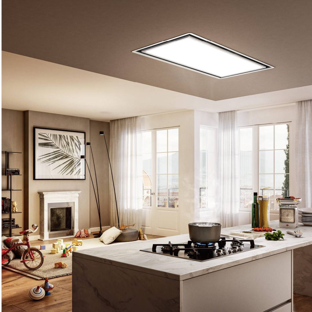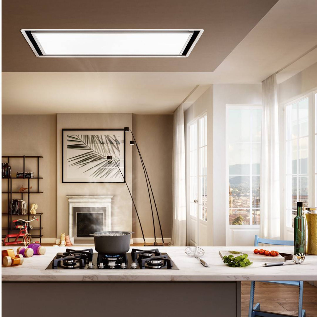 Mennyezeti páraelszívó, amelyet úgy terveztek, hogy fényt hozzon a konyhába. Az elszívó rendszer rejtve van, így helyet hagy a LED-panelnek, amelynek fényerősségét és tónusát is lehet állítani.