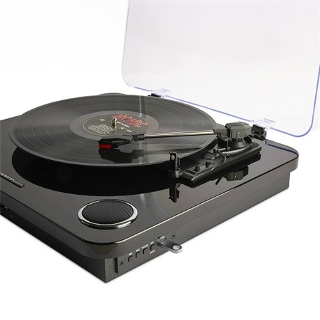 Lemezjátszó 10 W-os hangszórókkal, automatikus leállítás funkcióval, Bluetooth be- és kimenettel, RCA és USB lejátszó/felvevő csatlakozással.