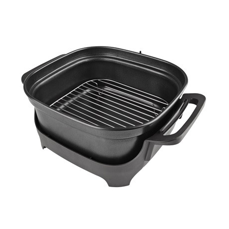 A fedő üvegablakú, így mindent folyamat jól megfigyelhető azon keresztül. Különleges szellőzőnyílásokkal van ellátva a tökéletes használati élményért. A tepsi tapadásmentes teflonból készült, amely könnyen eltávolítható és tisztítható. Stabil lábak gondoskodnak az edény biztonságos helyéntartásáról.