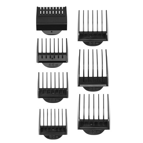 - 6 cserélhető fésű-feltét (4-6 mm, 7-9 mm, 10-12 mm, 16-18 mm, 22-24 mm, 28-30 mm)