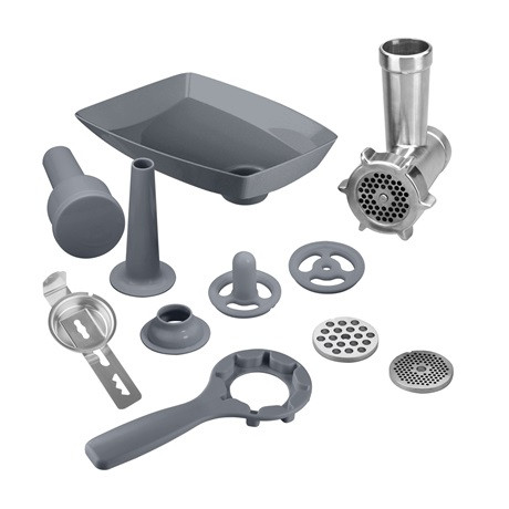- Húsdaráló 62 mm átmérőjű (3 méretű darálólap, toldat kolbászkészítéshez, tartozék Kebbe készítéséhez, sütikészítő, döngölő, garat, kioldókulcs)
