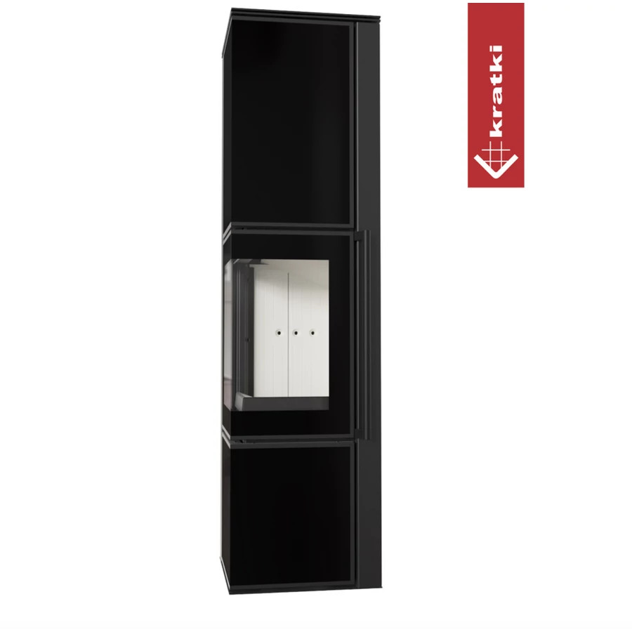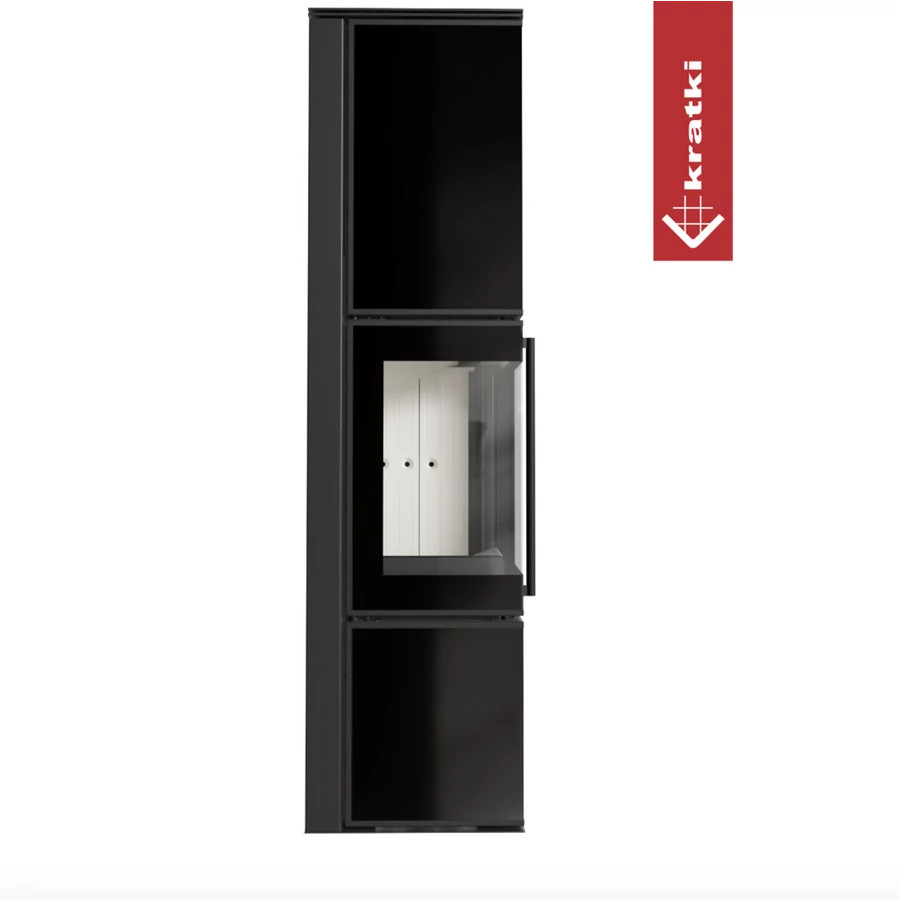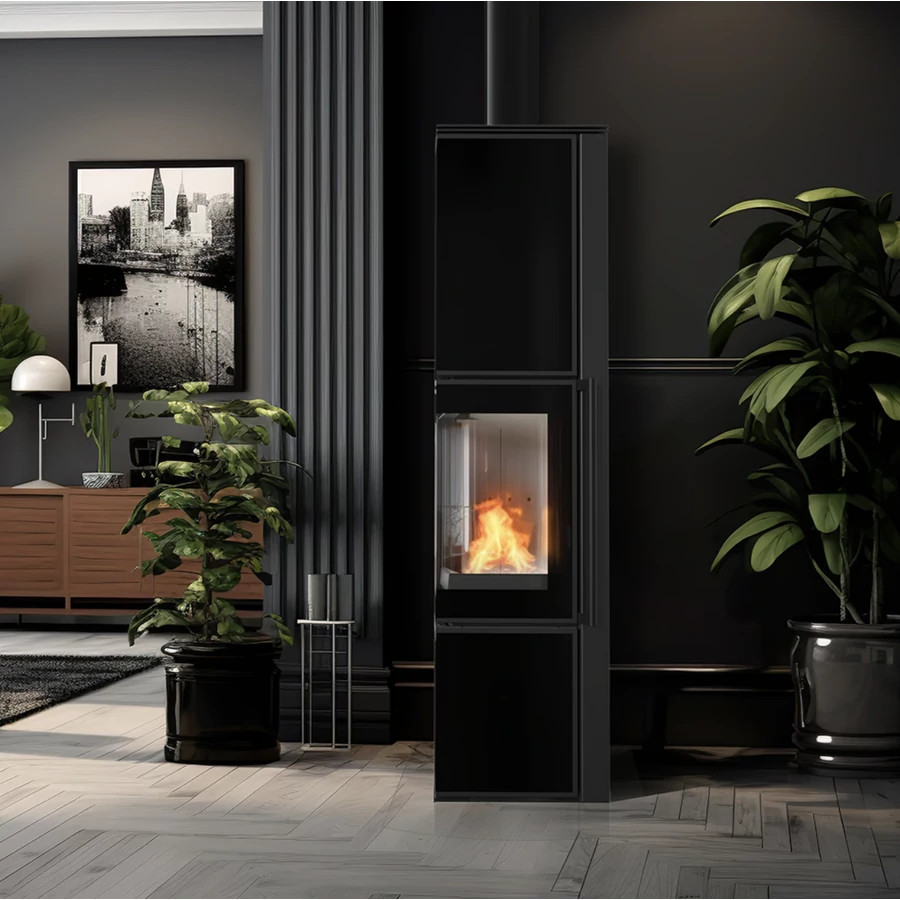 A 600°C-ig hőálló üveg biztonságos és tartós, míg a dekoratív rész esztétikus, fekete díszítéssel elegáns megjelenést kölcsönöz a kályhának.