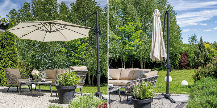 Az árnyékoló a szerkezet oldalán helyezkedik el, amely lehetővé teszi az árnyékolt tér 100% -os kihasználását. A napernyő lehetővé teszi, hogy árnyékos helyet hozzon létre a kikapcsolódásra, a közös étkezésre vagy a szeretteivel való találkozásra. A kerti felszerelések alapvető elemei a kerti napernyők. Kiváló védelmet nyújtanak mind a napsugárzás, mind a nyári eső ellen.