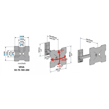 Az ER200 egy dönthető forgatható karos TV fali konzol VESA 50-75-100-200 mm-es felfogatási lehetőségekkel, amely lehetővé teszi a képernyő függőleges és vízszintes megdöntését.