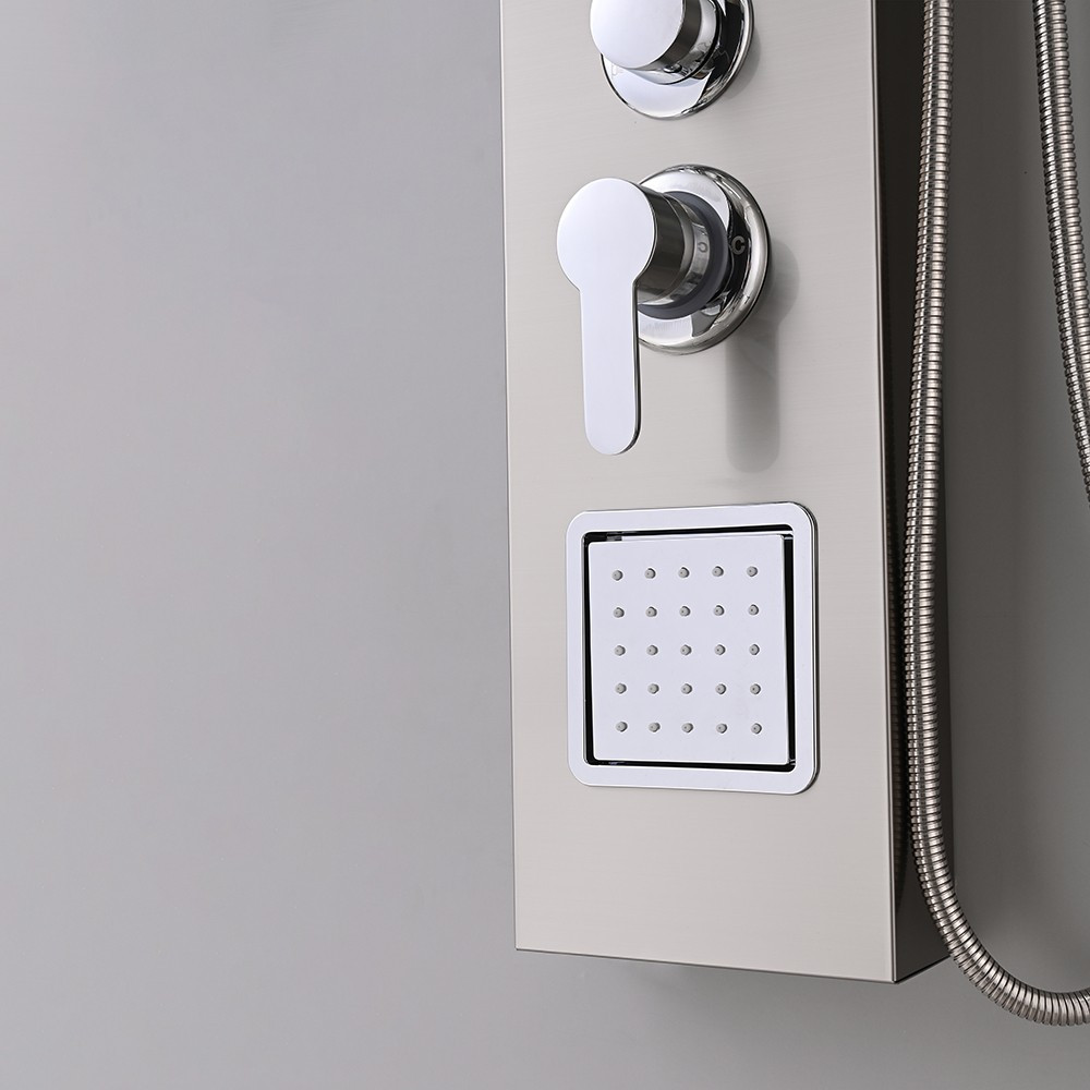 A zuhanypanel további funkciói közé tartozik egy vízesés, amely egy másik különleges élményt nyújt. A vízesésnek köszönhetően a víz folyik lefelé az ember hátára, kellemes masszázsszerű hatást nyújtva, és feloldva az izmok feszültségét. A vízesés funkcióval kombinálva hátsó fúvókák találhatók a zuhanypanelen, amelyek különösen jótékony hatással vannak a hátmasszázsra. A zuhanypanel további kényelmi funkcióval rendelkezik egy kézi zuhannyal is, amely lehetővé teszi a célzottabb vízirányítást és a zuhanyozás személyre szabását. A kézi zuhany praktikus, ha nem szeretnénk beállni az esőztető vagy a vízesés alá, vagy ha csak a hajmosáshoz vagy a test adott részének tisztításához van szükségünk a zuhanyozás közben.