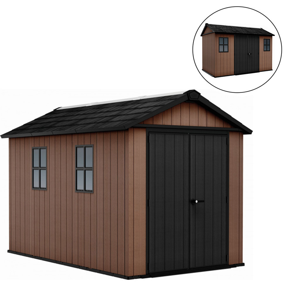 A Newton Plus kerti ház nemcsak praktikus, hanem esztétikus is. A barna színű EvoTech anyag valósághű fa textúrát biztosít, anélkül hogy a fa gondozási igényeivel kellene számolni.
