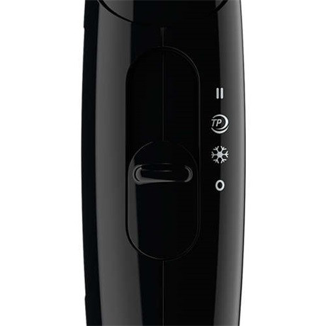 A gyors levegőbeállítás (II) nagyobb hőmérsékletet és erőteljesebb légáramlást biztosít. Kis mérete ellenére 1200 W-os teljesítményt biztosít, így Ön hatékonyan és kíméletesen száríthatja meg a haját.