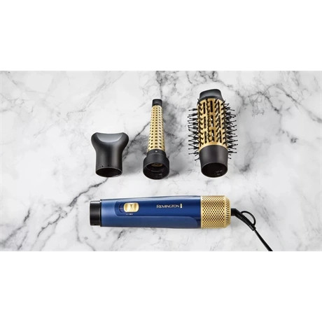 A mélykék és pezsgőszínű elemek színkombinációjával tervezett Remington Sapphire Luxe meleglevegős hajformázóval mindenhol feltűnést kelthetsz, ahol készülődsz. Bármilyen legyen is a személyes stílusod, a hajad gyönyörűen sima lesz a zafírral dúsított fejlett kerámia bevonatnak köszönhetően. Az ionos kondicionáló ellensúlyozza a statikus feltöltődést szárítás és formázás közben, hogy csökkentse a szálló hajszálakat, és ragyogó legyen a végeredmény. A szárításhoz, az előkészítéshez és a formázáshoz való három tartozékkal könnyedén kialakíthatod kedvenc frizurádat. A vegyes sörtéjű körkefe kiválóan alkalmas a töveknél a volumen növelésére és a strukturáltabb frizurák formázására, míg a kerámia göndörítő kúpvas gyönyörű, természetesnek tűnő fürtöket készít.