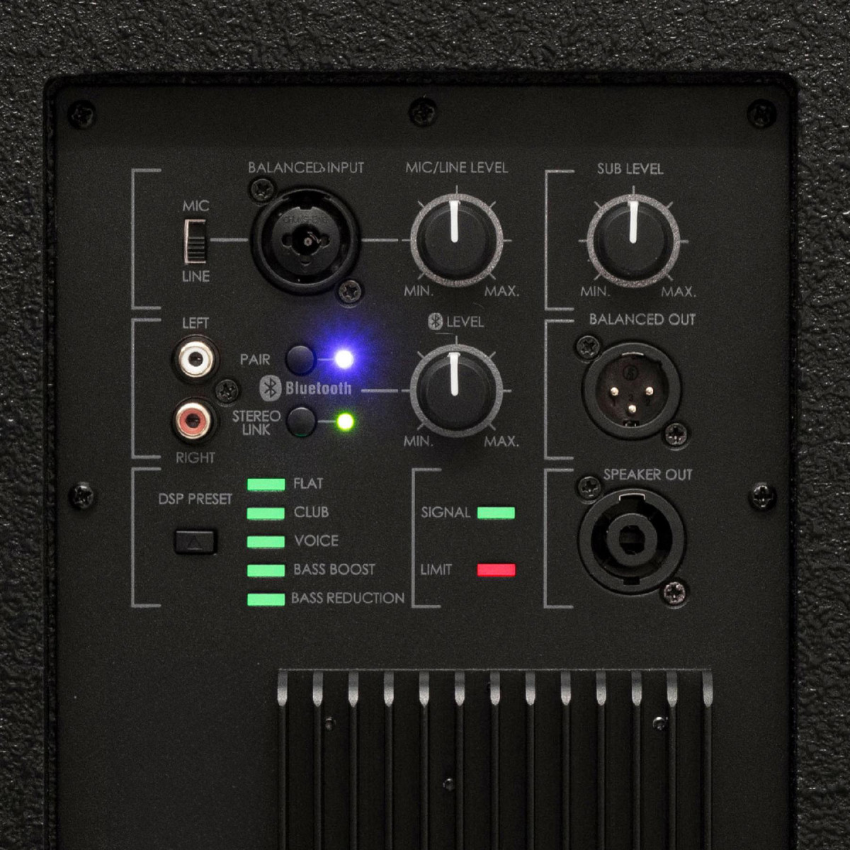 Ez a 2-utas, aktív bass-reflex hangrendszer egy 10”-os mélynyomóval és négy 3”-os szélessávú neodymium hangsugárzóval dolgozik összehangoltan, hogy tökéletes egyensúlyt teremtsen a mélyek és a magasak között. A DSP digitális hangprocesszor öt előre beállított üzemmódot kínál a különböző zenei és előadói igényekhez, a BASS BOOST funkcióval pedig könnyedén kiemelhető vagy csillapítható a mélytartomány.