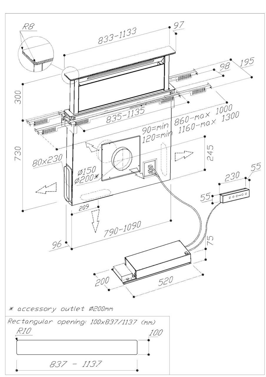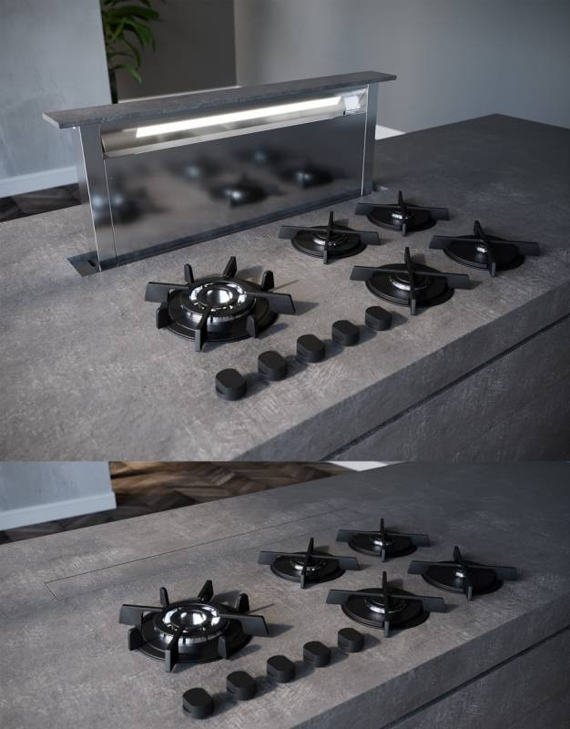 A 84 cm-es szélesség 90 cm-es minimális szekrényméretben pultba építve kiválóan illeszkedik a modern és klasszikus konyhákba egyaránt. A távirányítóval szinte a konyha bármely pontjáról kényelmesen vezérelhető: egy gombnyomásra kiemelkedik a pultból, beállítható a 3 fokozat és a turbó üzemmód, aktiválható az időzítő és kapcsolható a világítás. Ez a megoldás gyorsabb, kényelmesebb és biztonságosabb használatot tesz lehetővé, különösen akkor, ha egyszerre több fogást is el kell készítenünk.