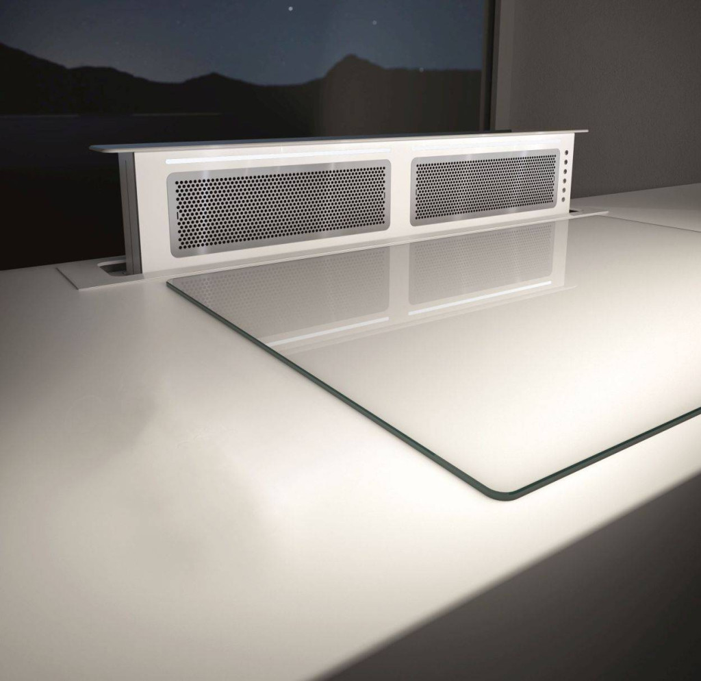 A fekete illetve fehér üvegburkolat vagy a rozsdamentes acél keret tökéletesen illeszkedik bármely konyhai környezethez. A fedlapot megnyomva az elszívó kiemelkedik a pultból amit nyomógombbal vezérelhetünk. A rozsdamentes acél szűrők és a led világítás tökéletessé teszik a terméket egy minimalista kialakítású konyhába is.