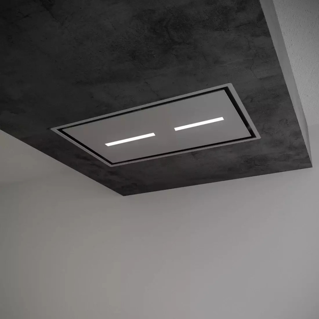 A SIRIUS SLT-971 EM páraelszívó mennyezetbe építhető kivitele tökéletes választás azokba a modern konyhákba, ahol a tágas tér, a funkcionalitás és a letisztult forma harmóniája elsődleges szempont. A 120 cm széles készülékház elegánsan simul bele a mennyezeti síkba, miközben látványosan kiemeli a konyha magas színvonalú belsőépítészeti megoldásait. A fehérre festett rozsdamentes acél testet prémium fehér üveg panel koronázza meg, amely nemcsak látványos, hanem könnyen tisztán tartható is.